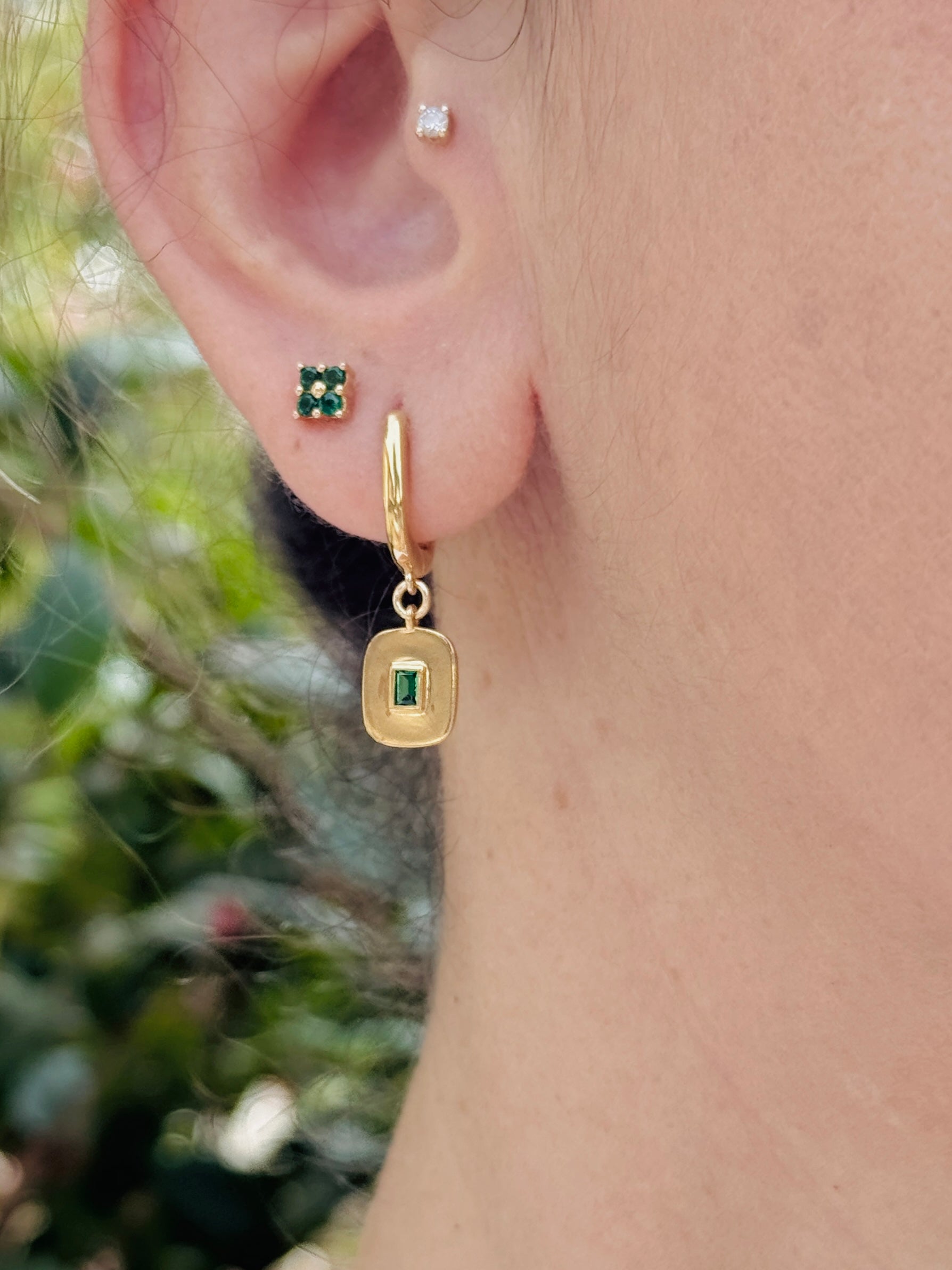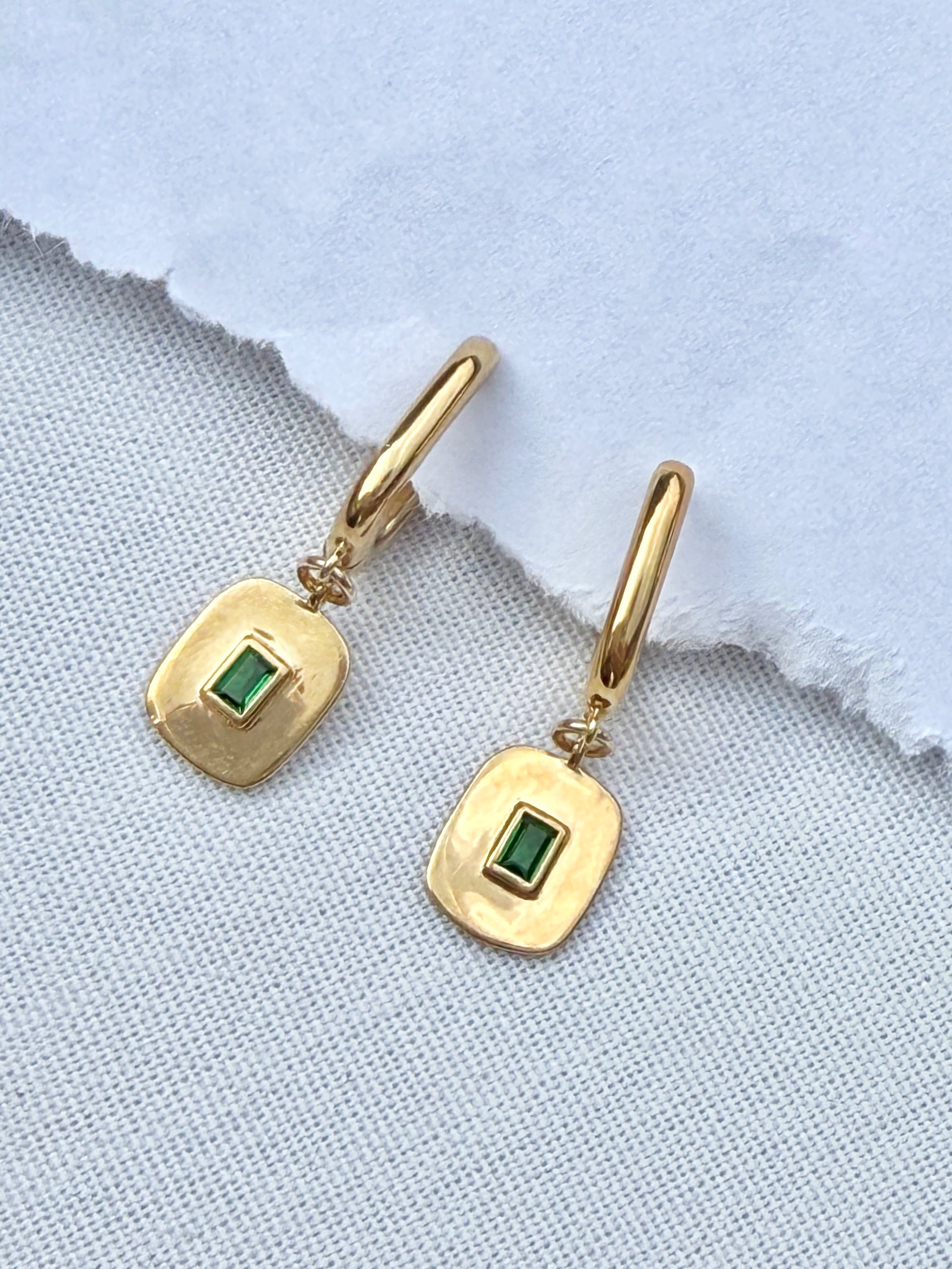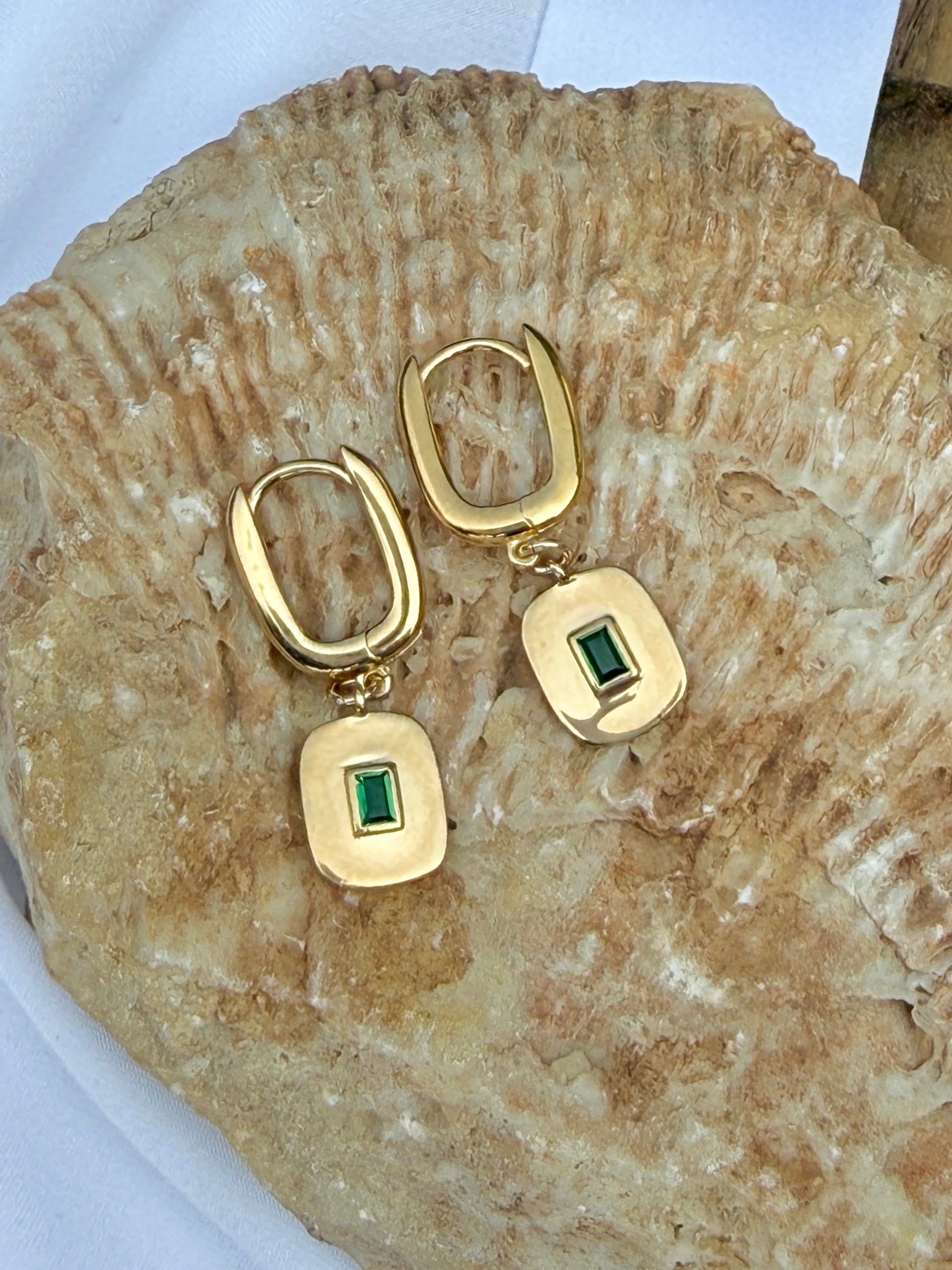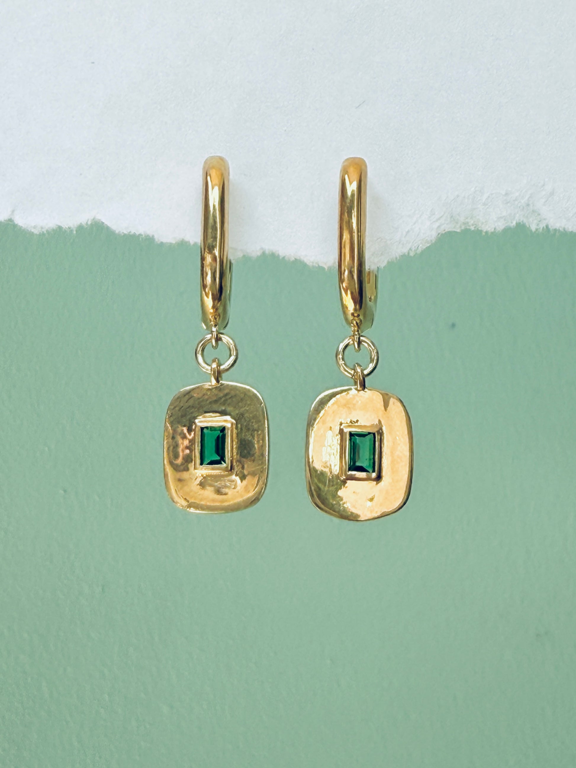 עגילי חישוק מלבניים בציפוי זהב עם שיבוץ ירוק.