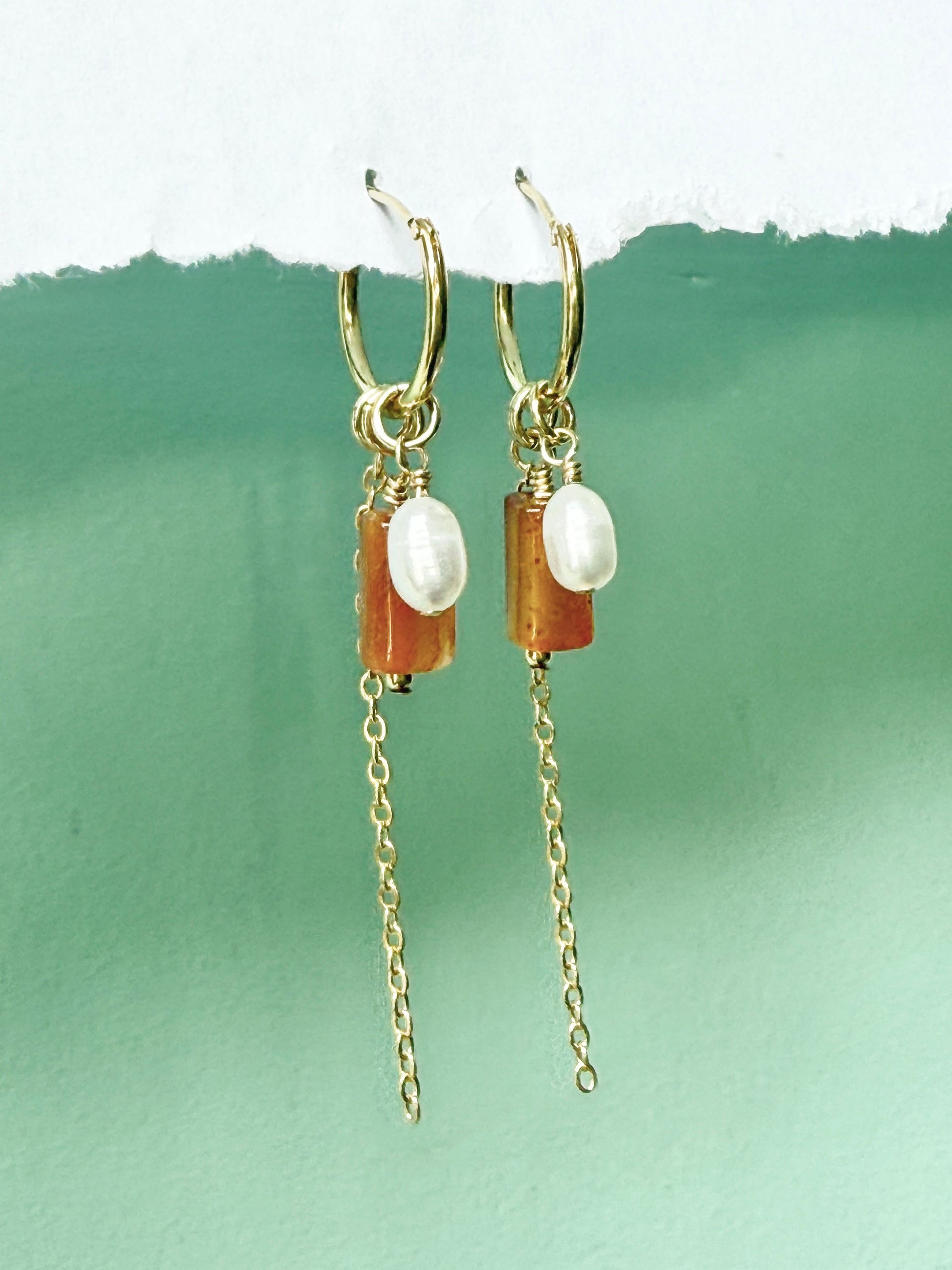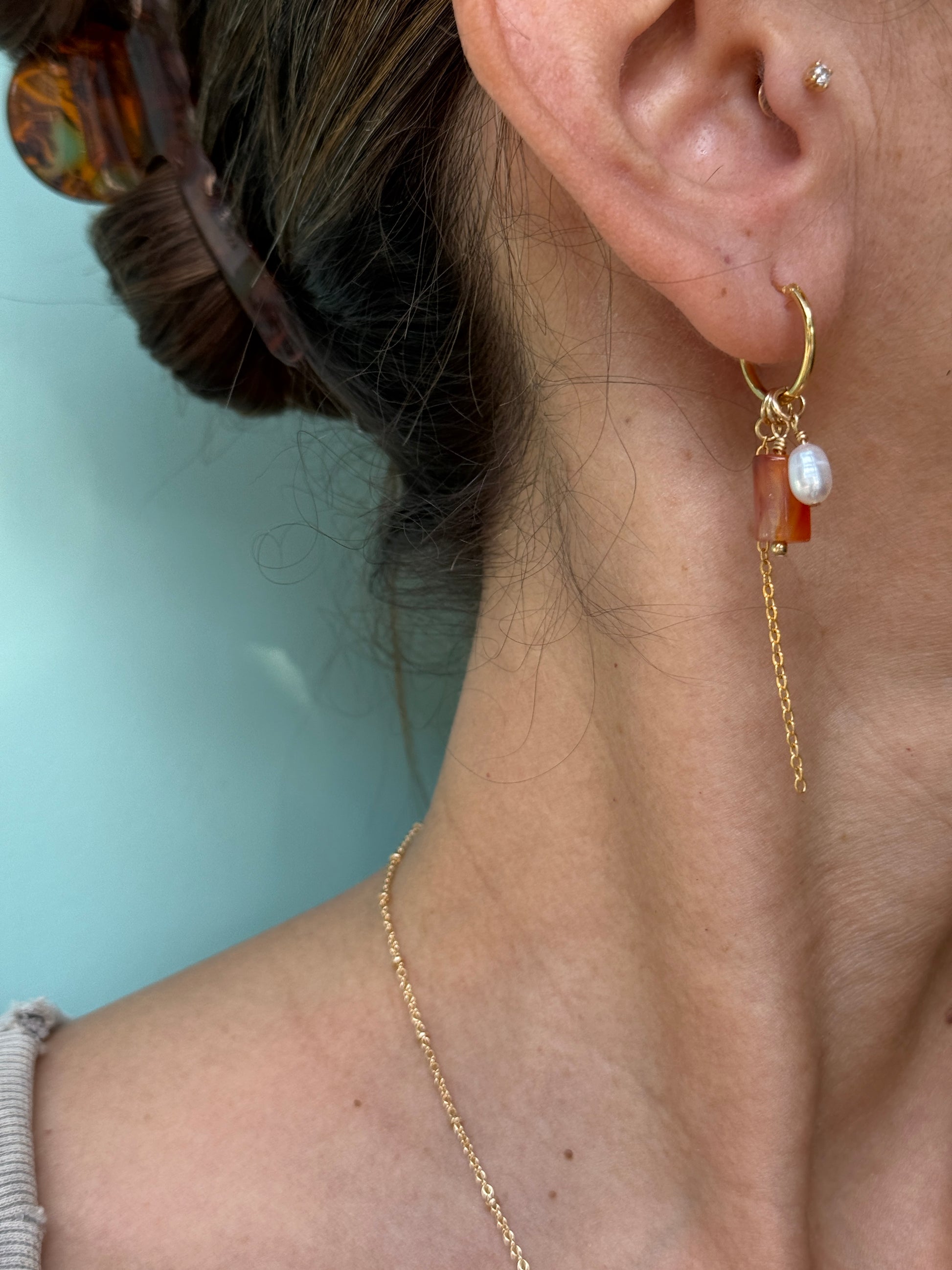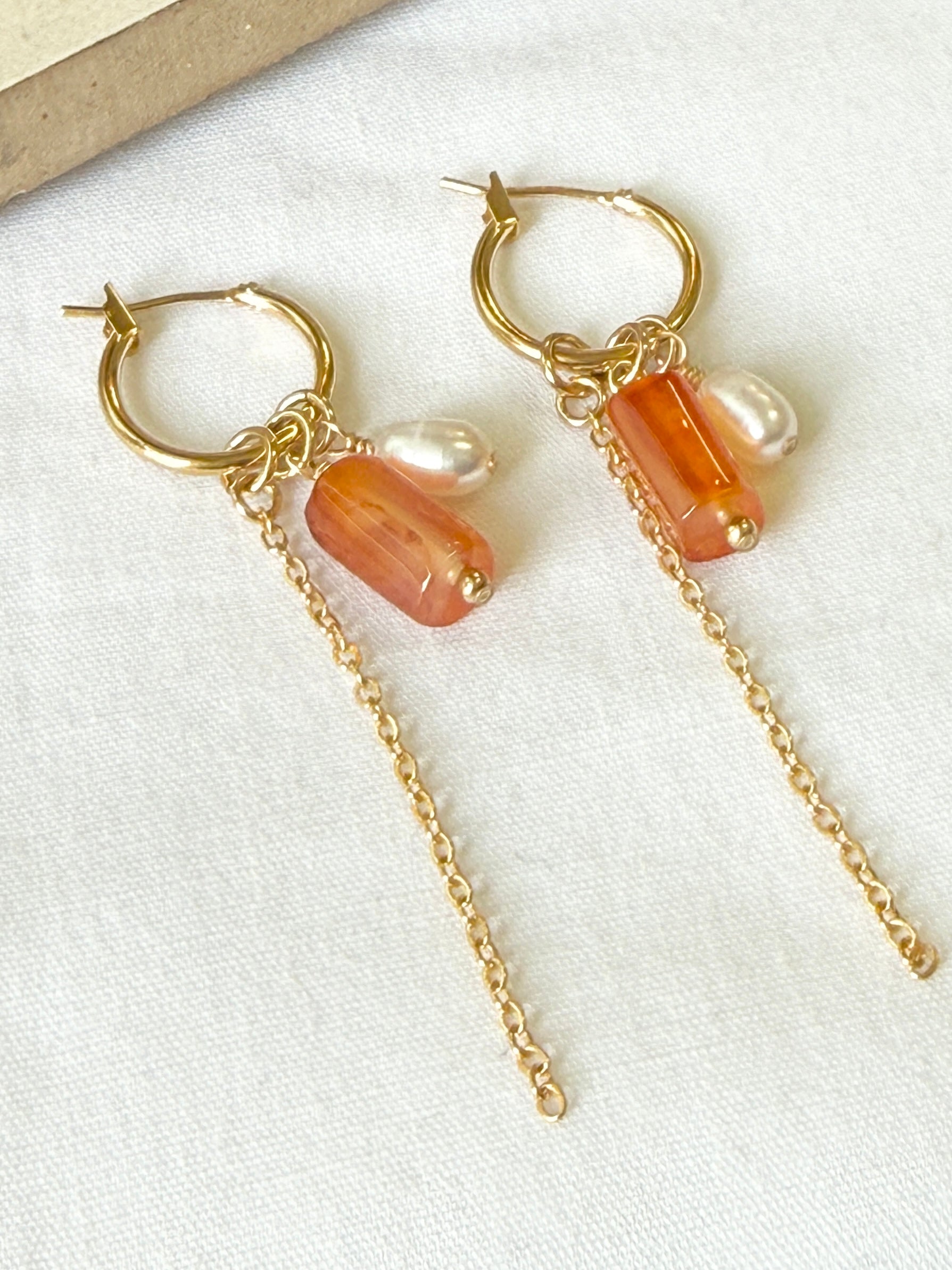 עגילי חישוק עם שלושה תליונים: שרוך, אבן קארניליאן ורודה ופנינים.