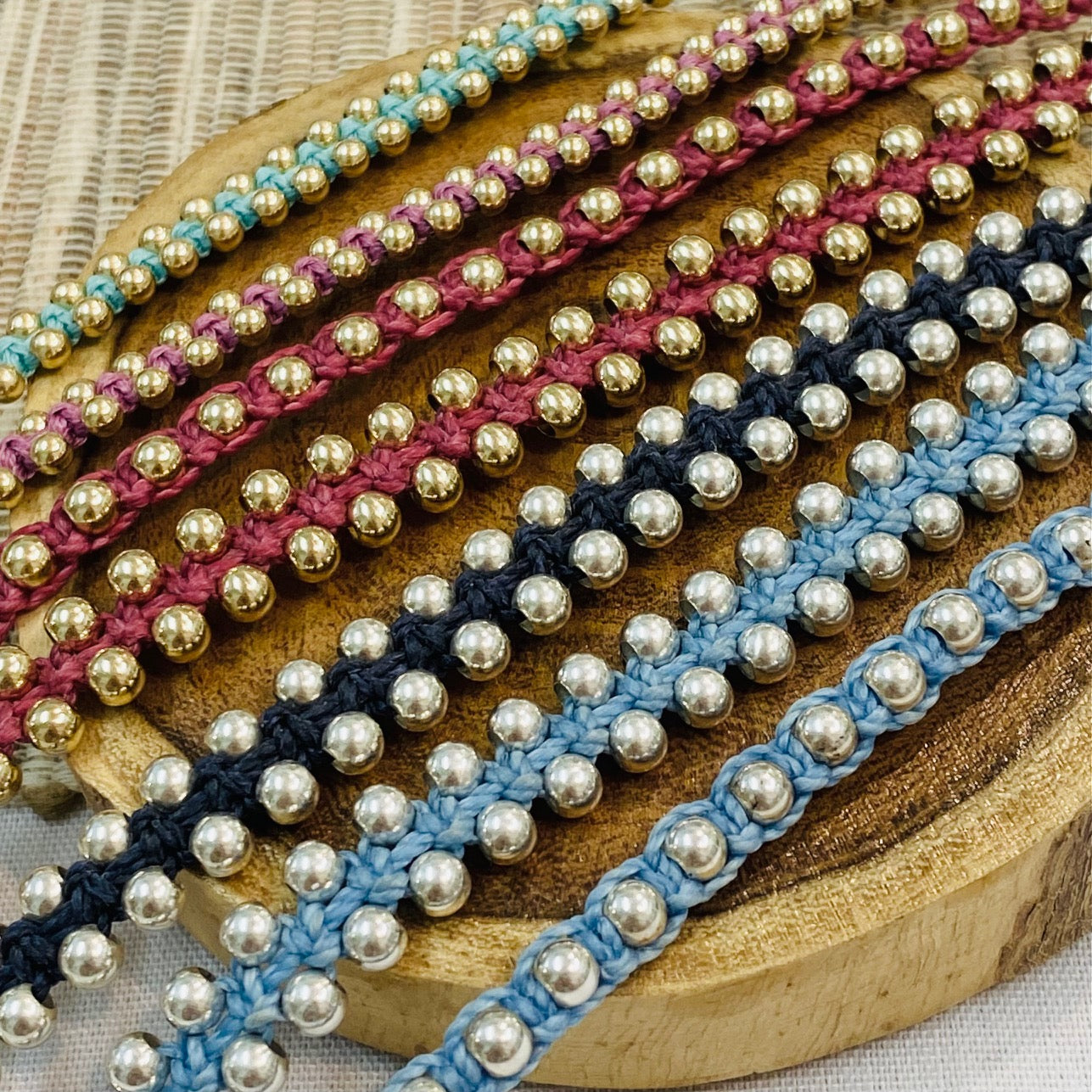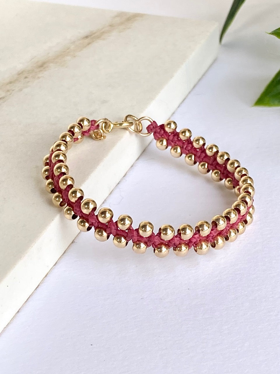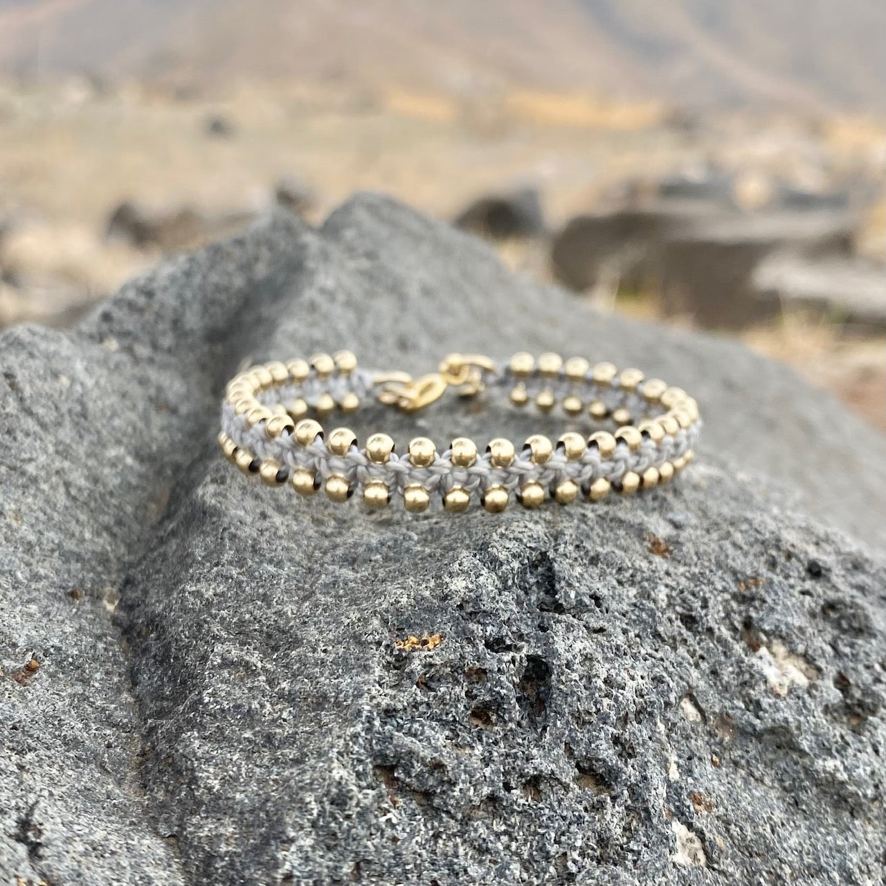צמיד קלוע בעבודת יד בעיצוב נקי ומדויק, המשלב חוט שעווה עמיד עם חרוזי גולדפילד או כסף בגימור חלק. הקליעה הצפופה יוצרת מראה מאוזן ונוכח, והחרוזים מוסיפים ברק עדין בלי עומס. הצמיד נוח לענידה יומיומית, משתלב היטב עם צמידים נוספים, ומתאים גם לענידה בפני עצמו.