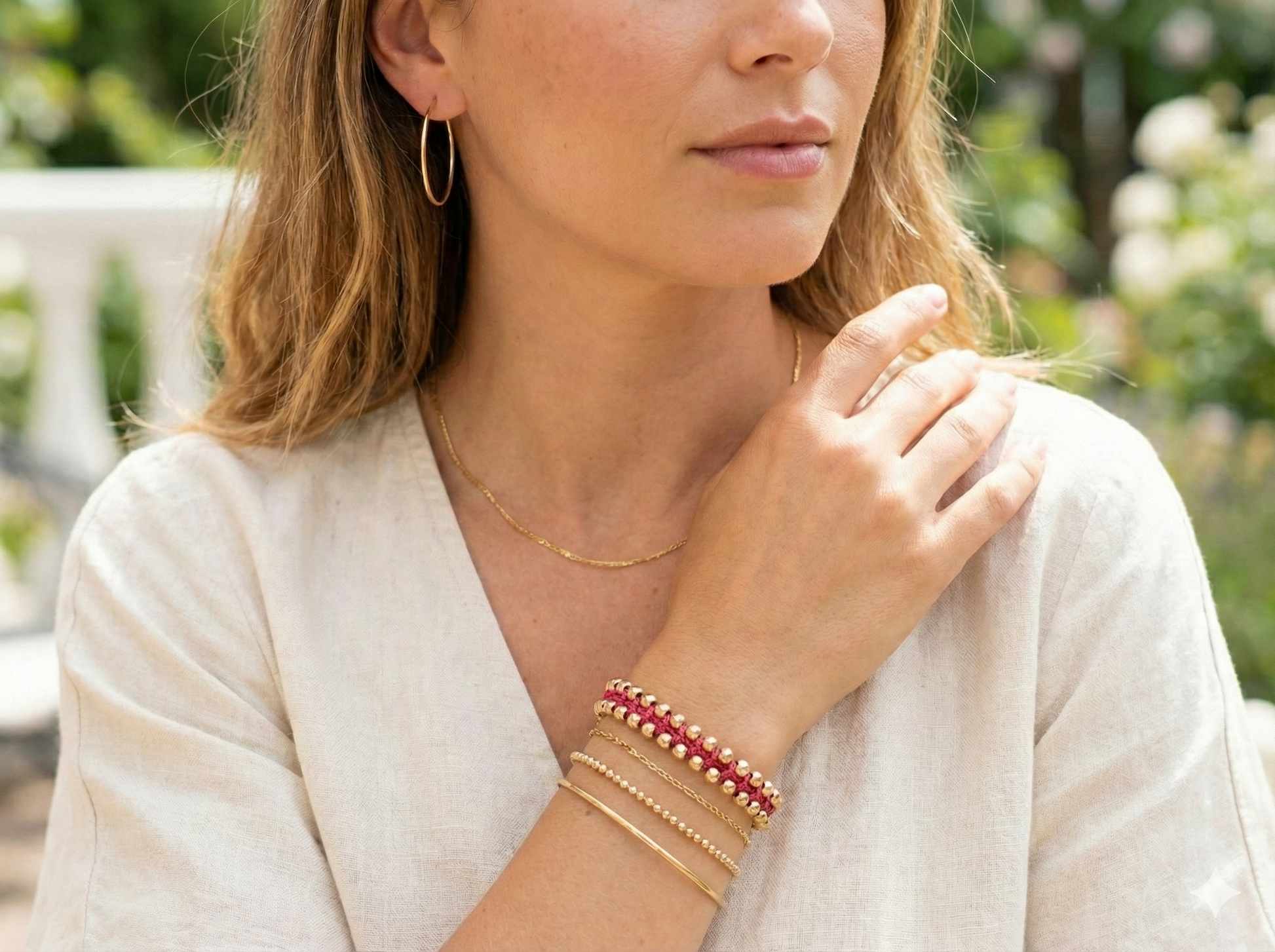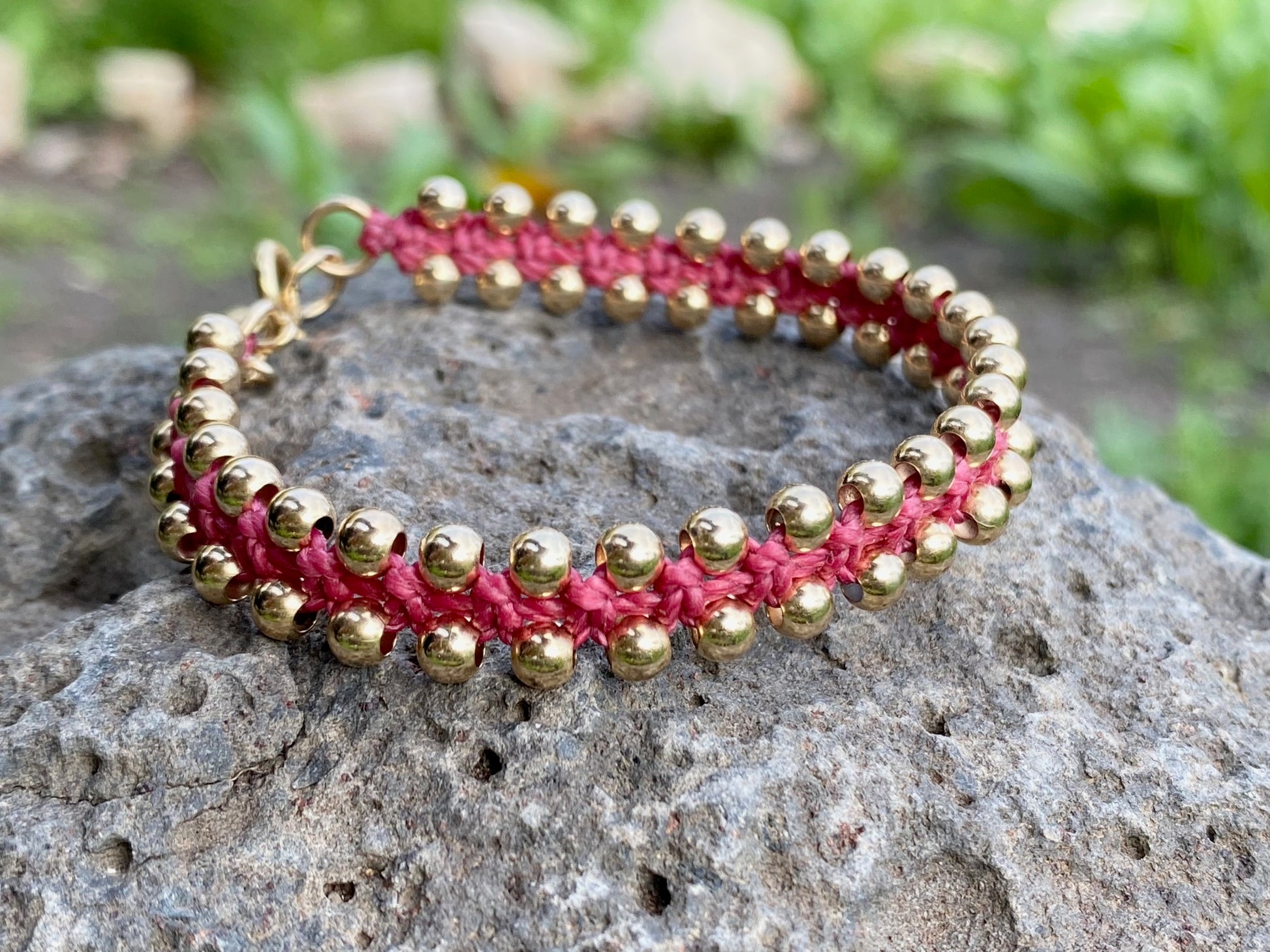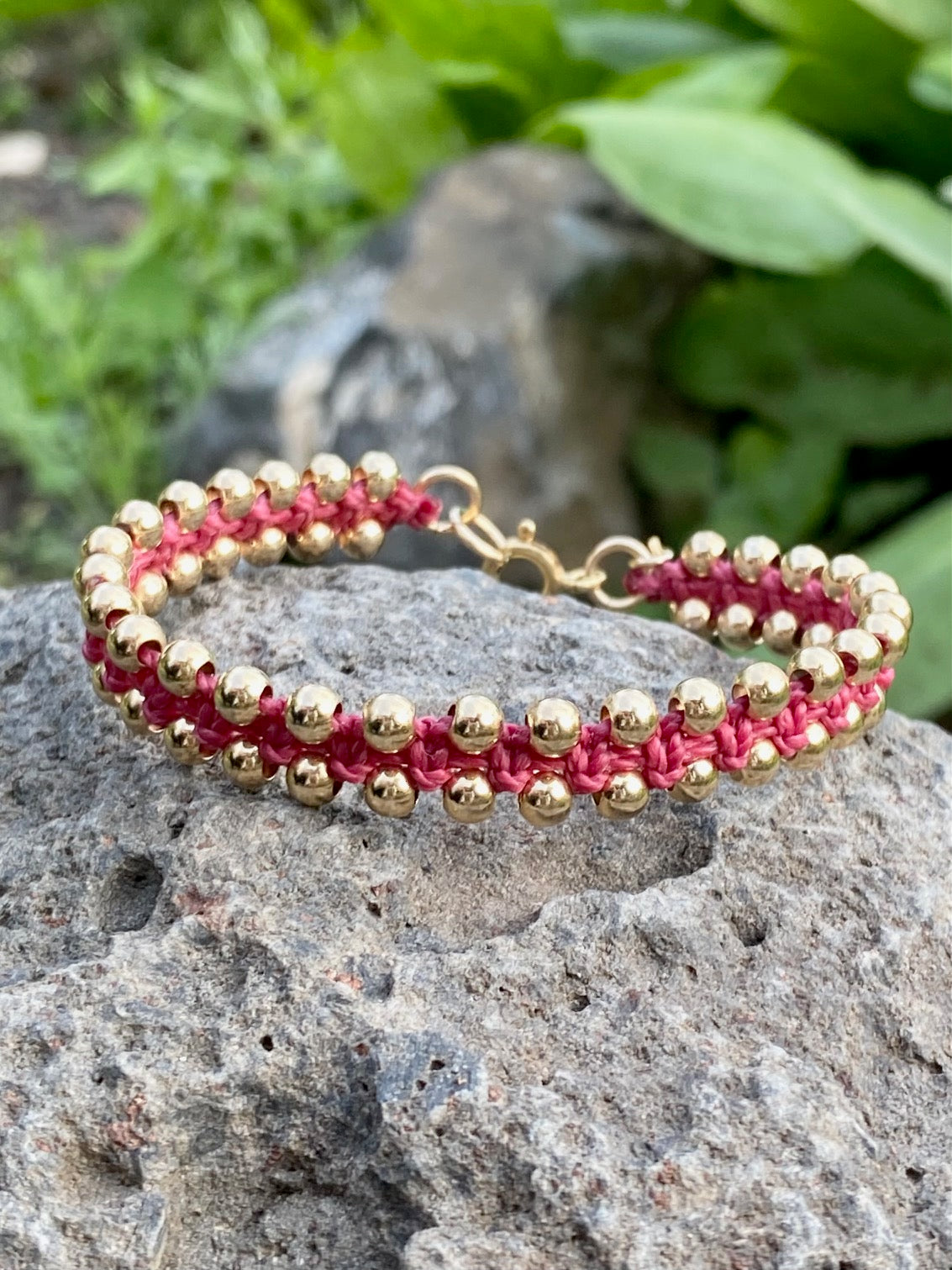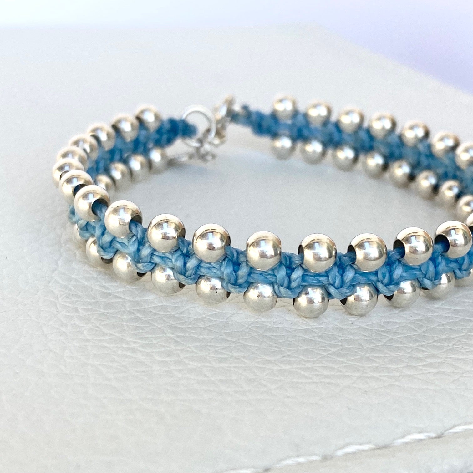 צמיד קלוע בעבודת יד בעיצוב נקי ומדויק, המשלב חוט שעווה עמיד עם חרוזי גולדפילד או כסף בגימור חלק. הקליעה הצפופה יוצרת מראה מאוזן ונוכח, והחרוזים מוסיפים ברק עדין בלי עומס. הצמיד נוח לענידה יומיומית, משתלב היטב עם צמידים נוספים, ומתאים גם לענידה בפני עצמו.