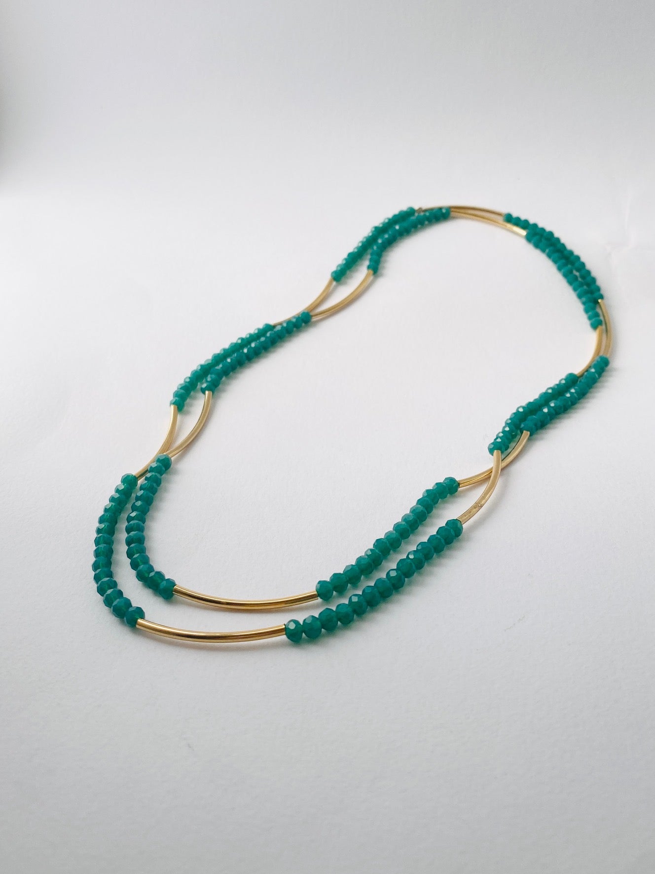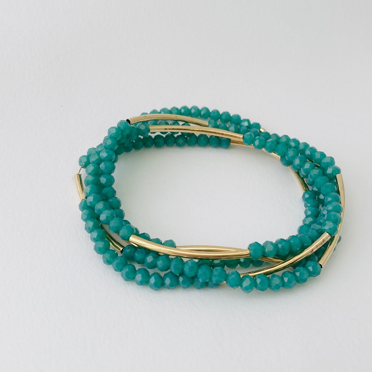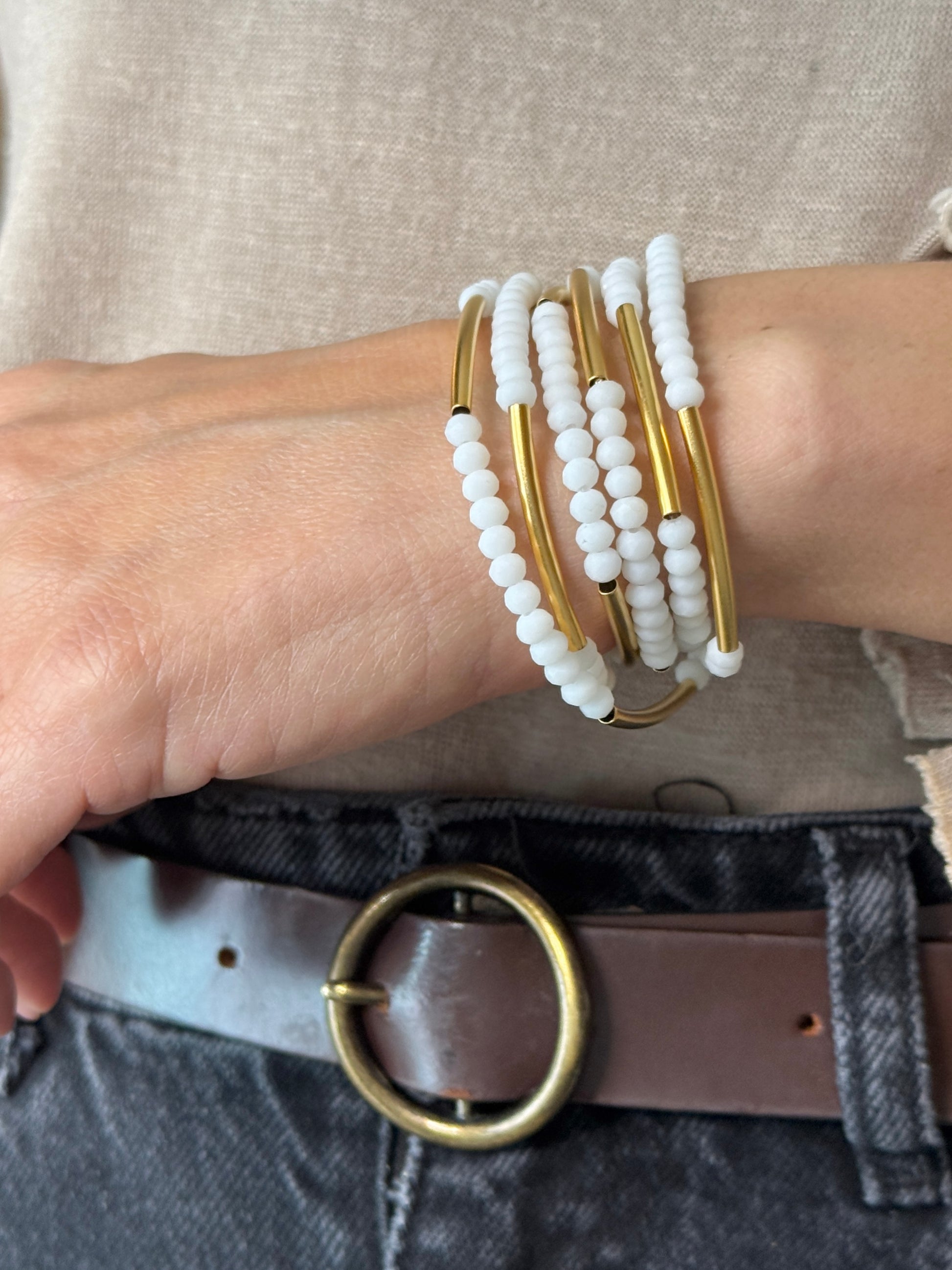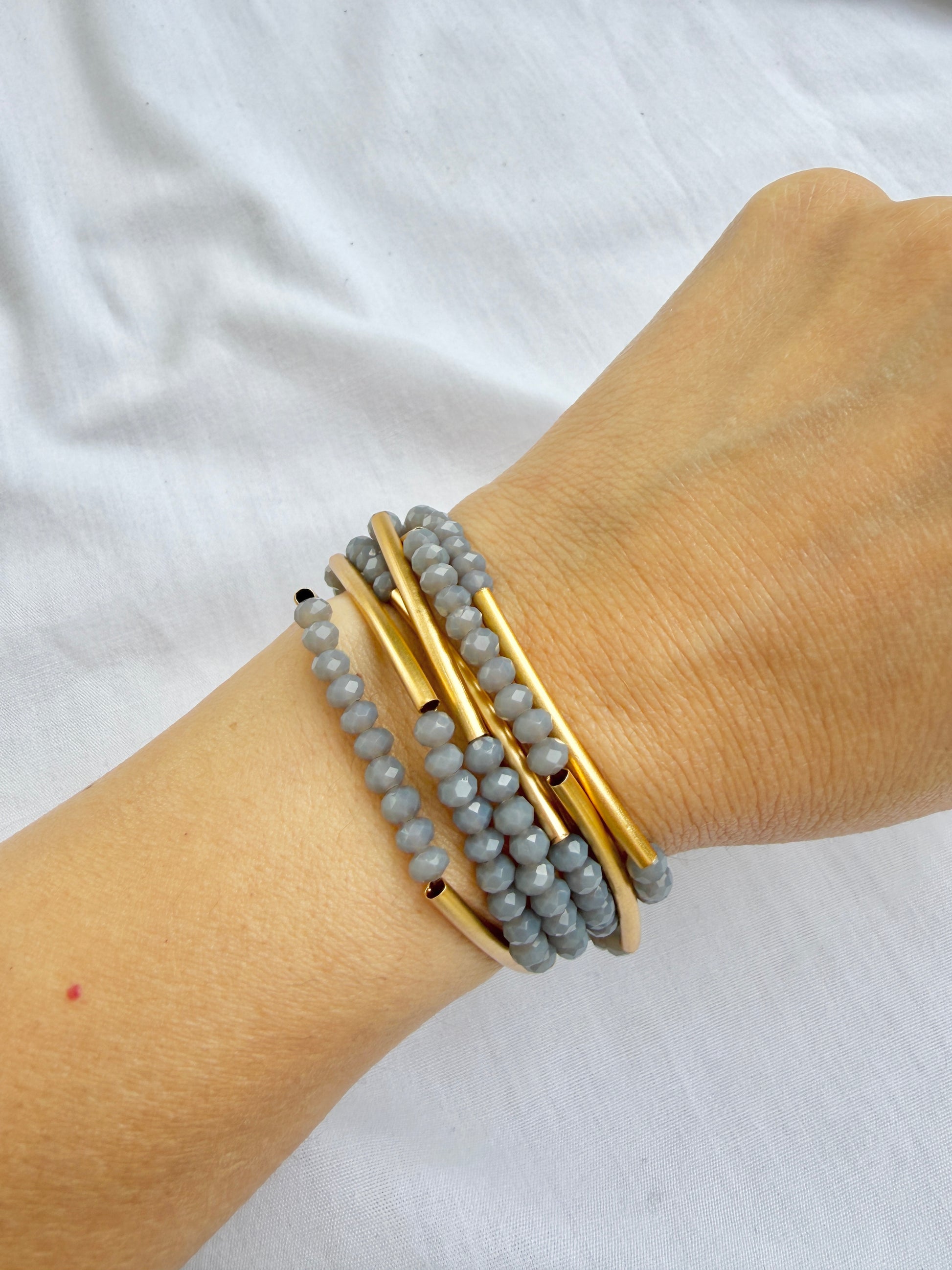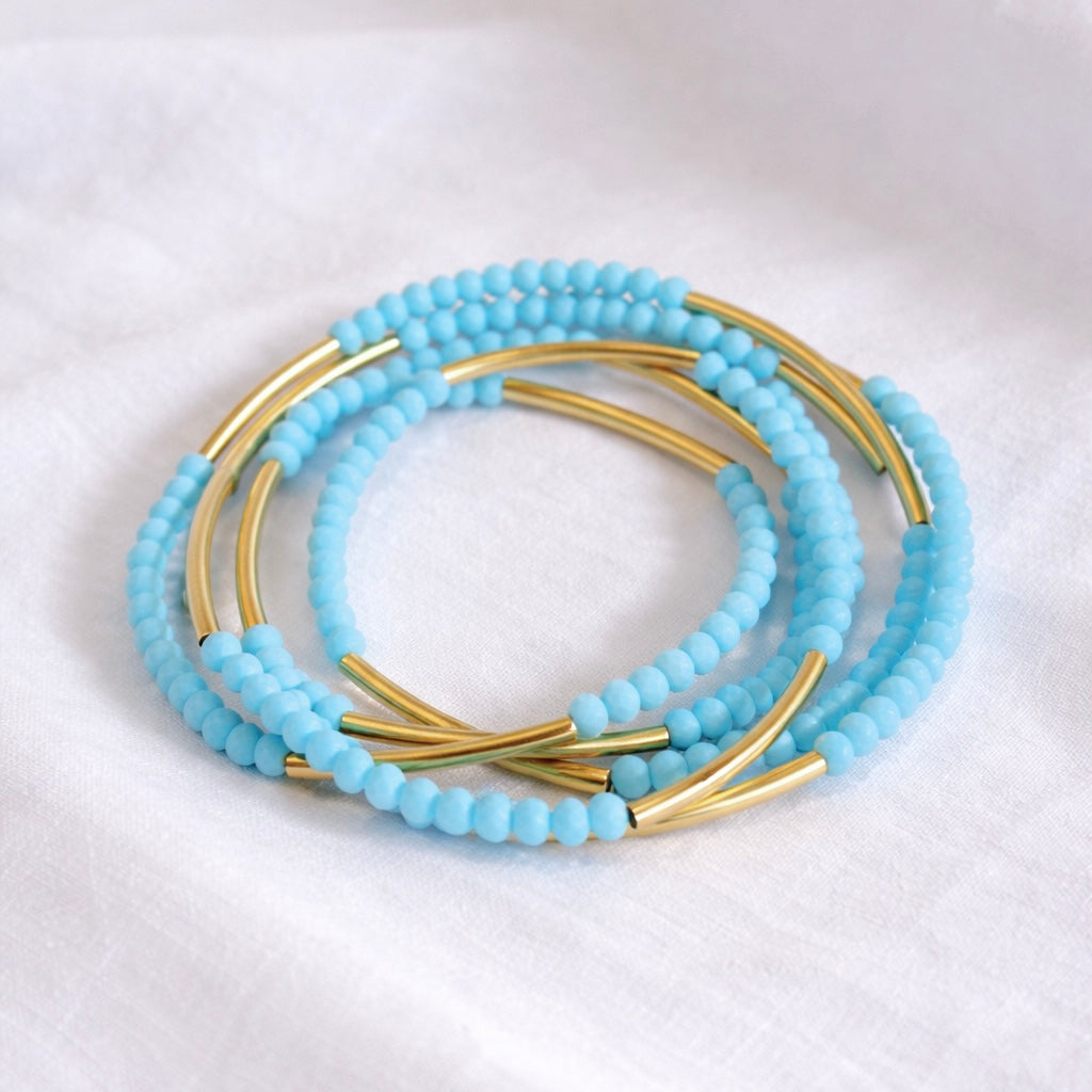 צמיד מתלפף ללא סוגר בעיצוב אלגנטי ורב שימושי. שילוב של חרוזי קריסטל קטנים עם צינורות בציפוי זהב בגימור מט יוצר מראה נקי, מאוזן ועשיר בפרטים. המבנה הגמיש מאפשר ענידה נוחה כצמיד מתלפף או כשרשרת ארוכה, ומתאים לשימוש יומיומי וגם לשכבות.