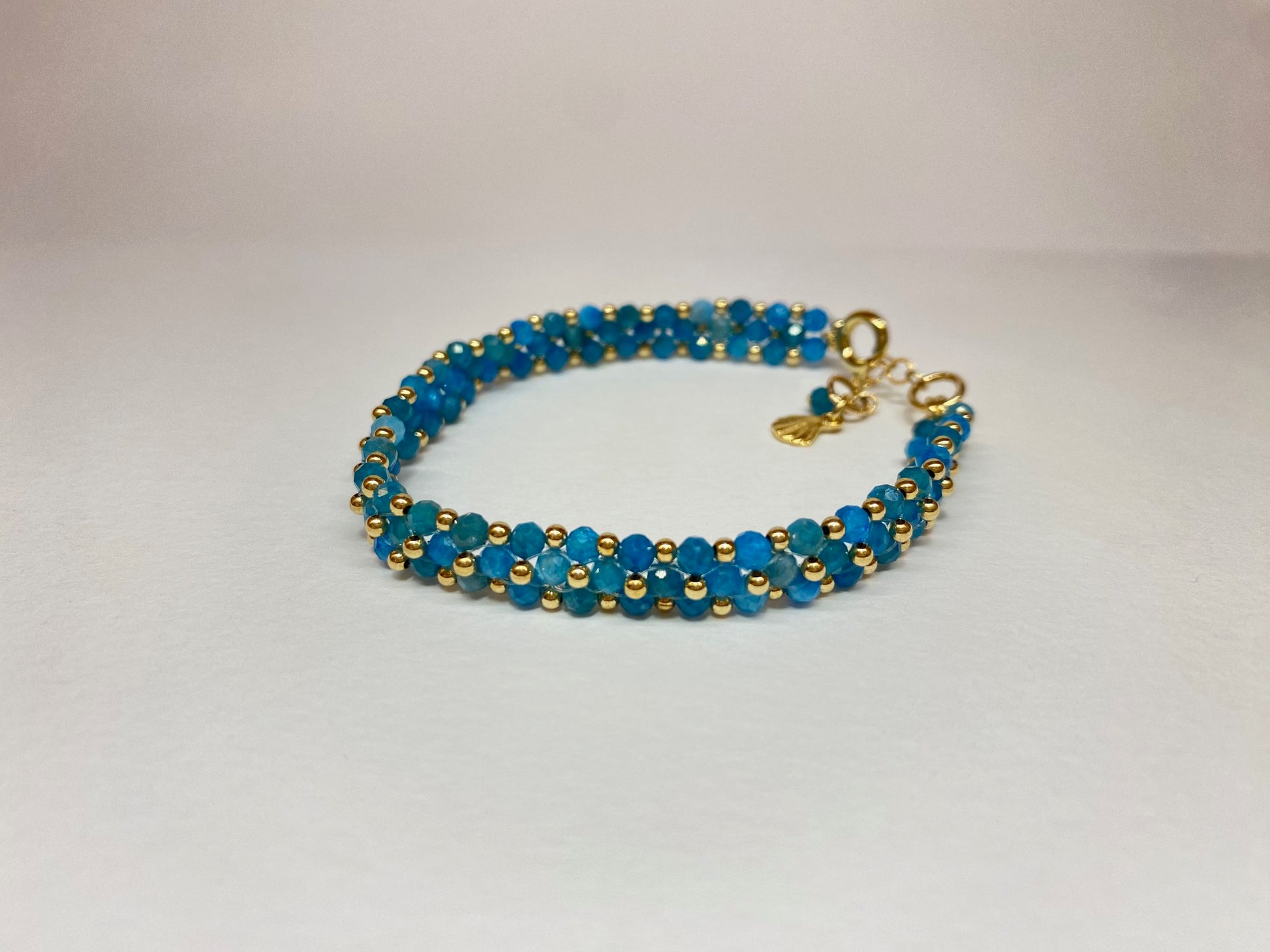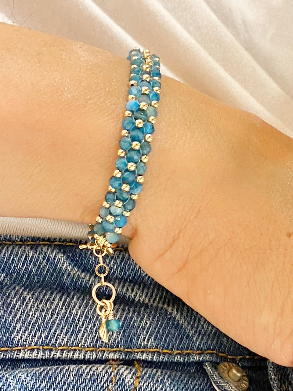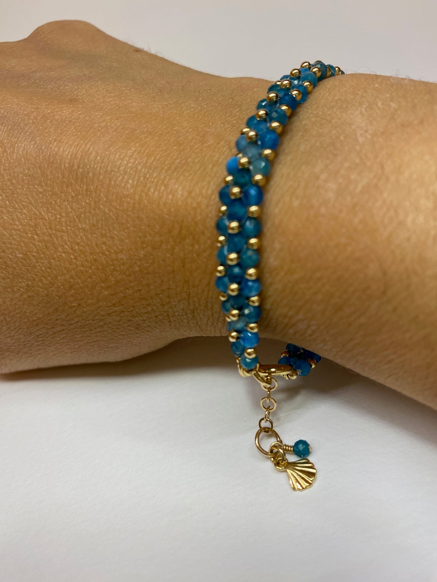 צמיד יחודי בעבודת יד עם חרוזי אבני אפטייט יפיפיות בגוונים עמוקים של כחול בשילוב מושלם עם חרוזי זהב שנותנים לו את המראה האלגנטי לצד המראה הטבעי של האבנים. סוגר עגול ועדין עם סיומת של תליון זהב בצורת צדף.