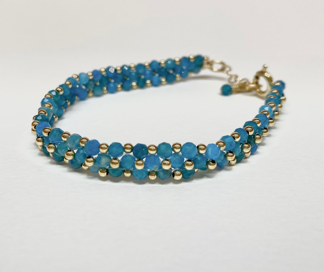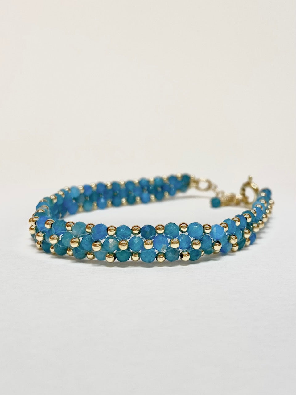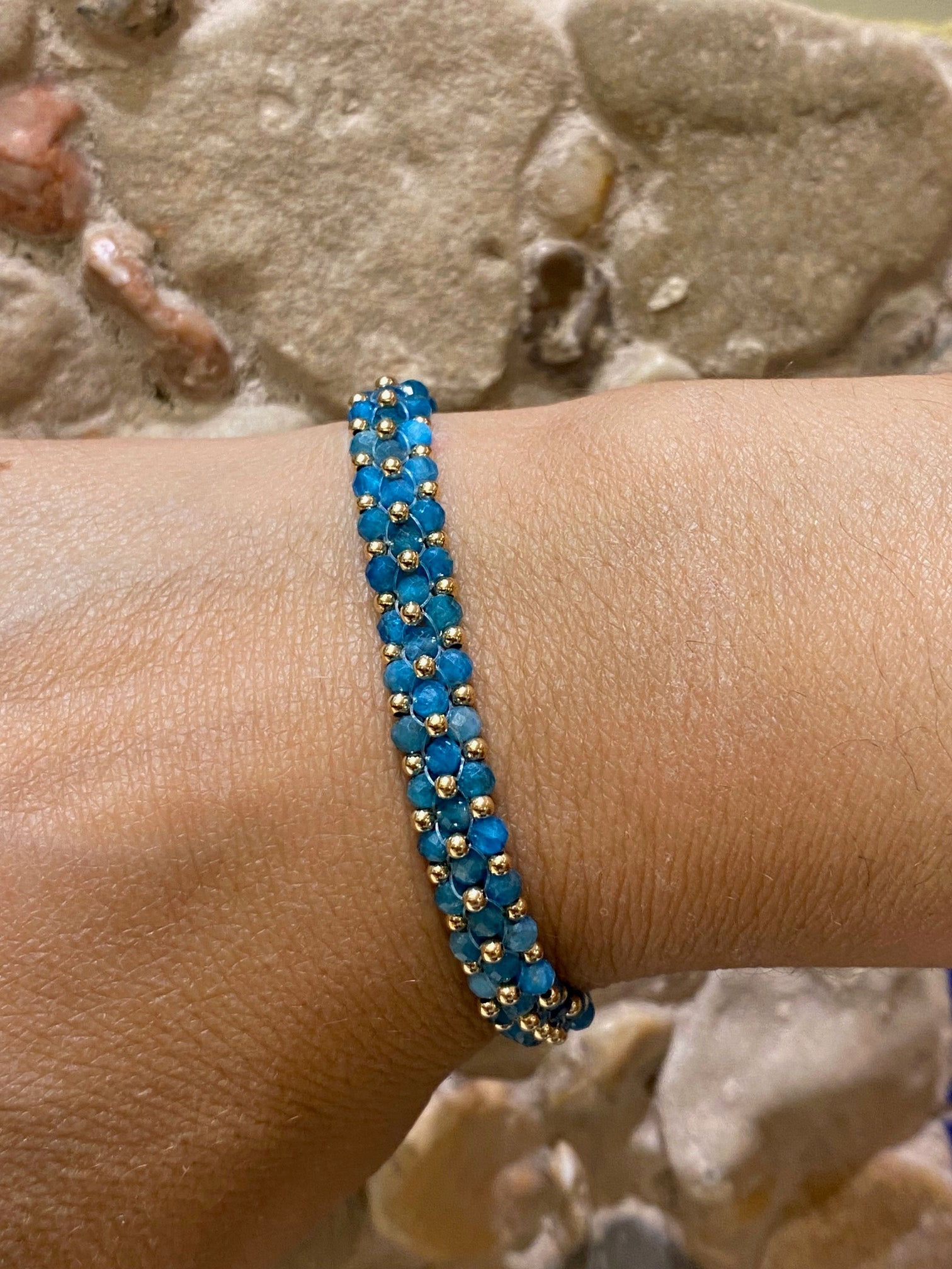 .צמיד עבודת יד מאבני אפטייט בגווני כחול ים עם חרוזי גולד פילד.