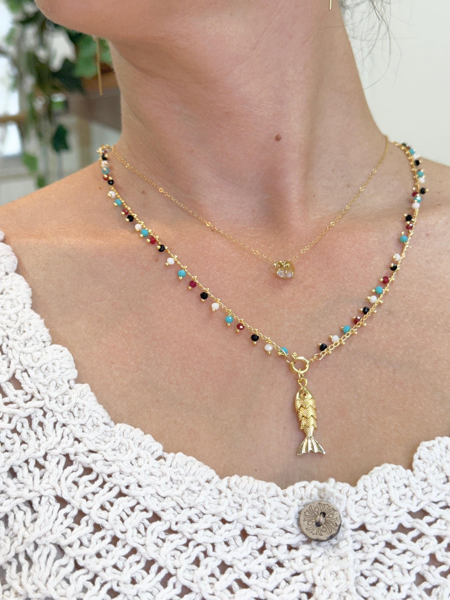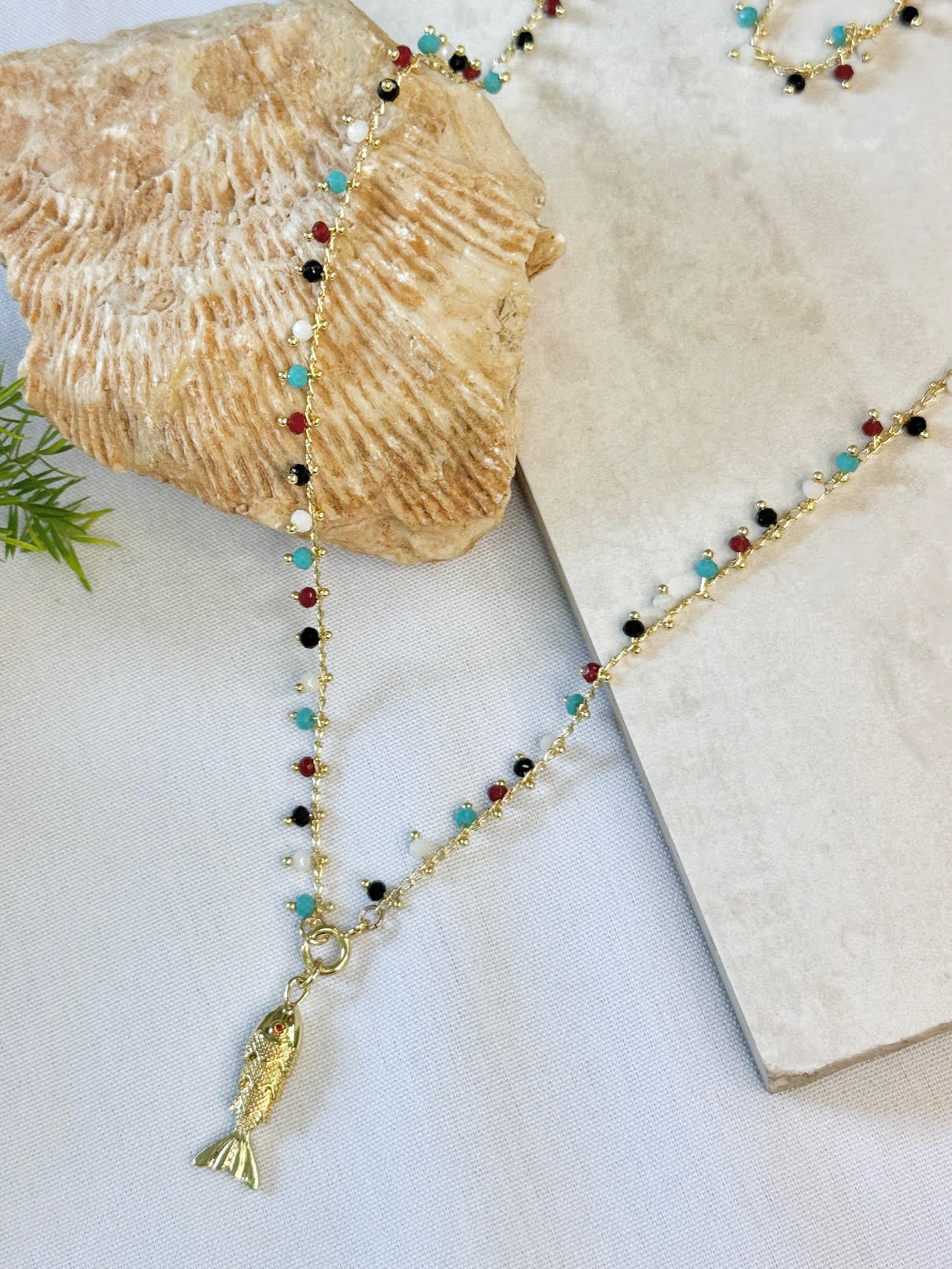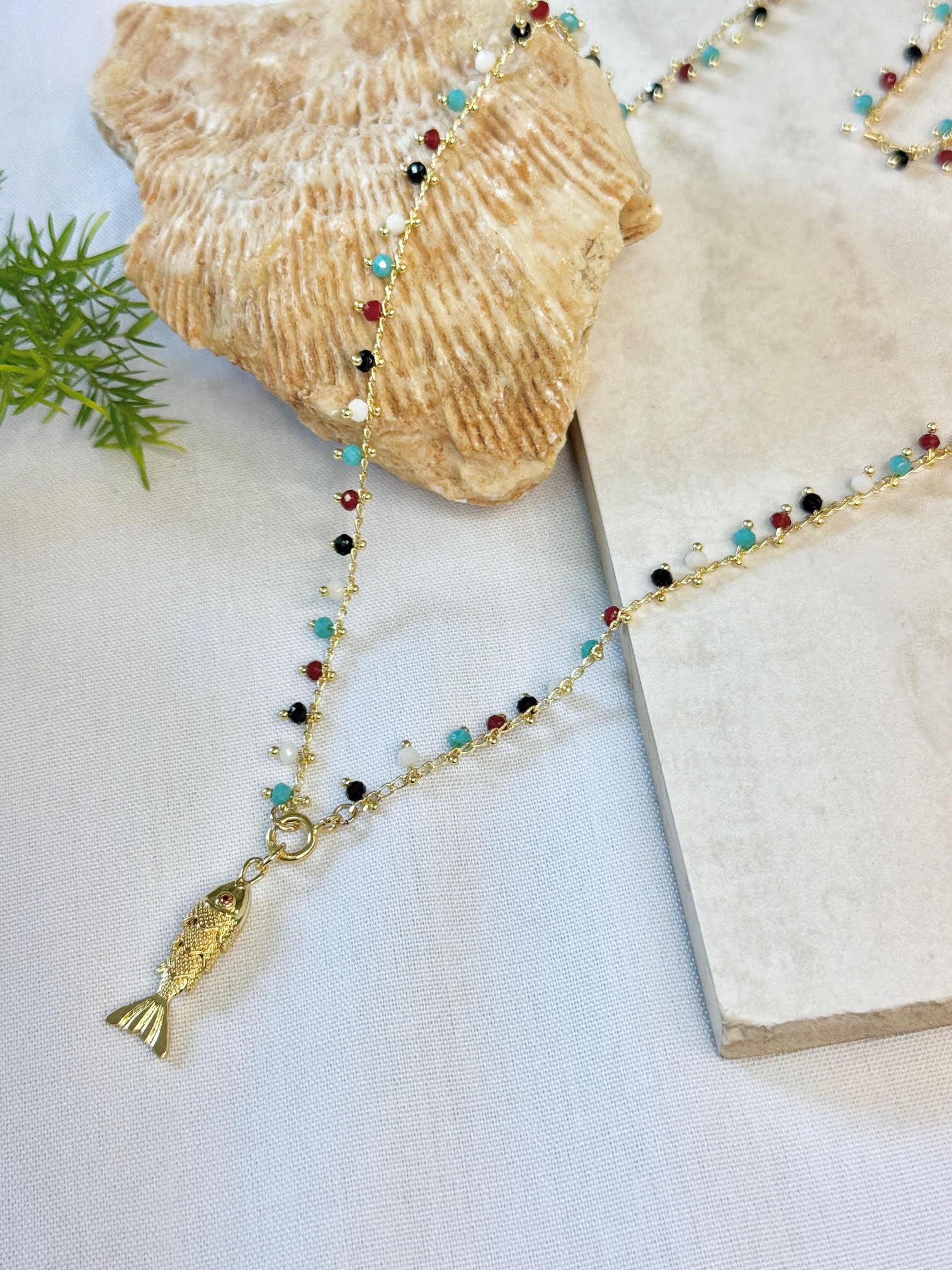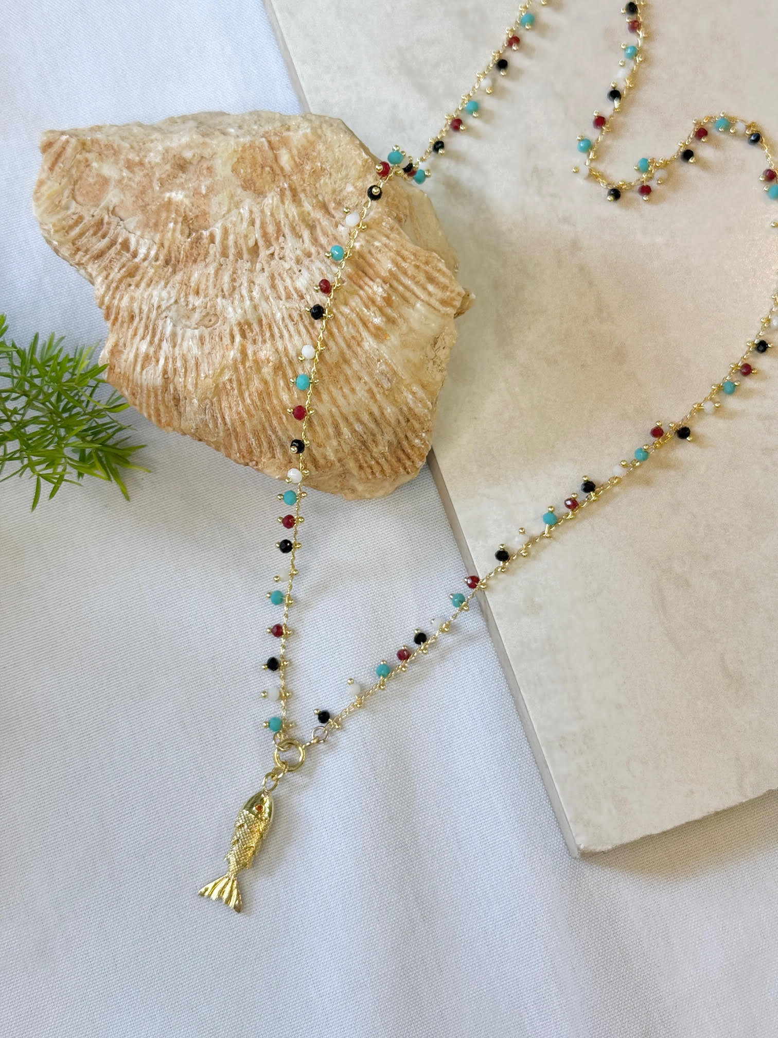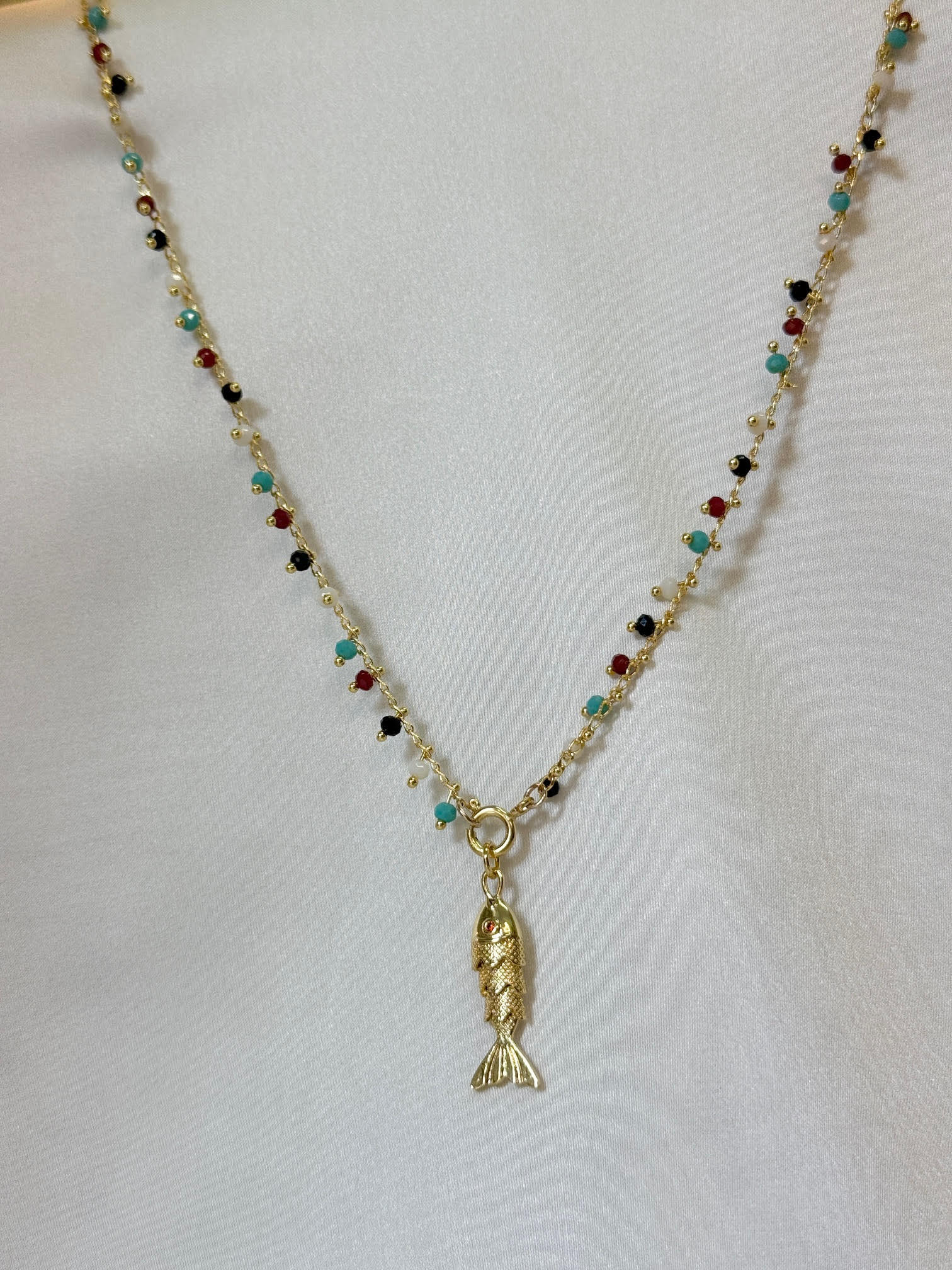 .שרשרת חרוזים צבעוניות בשילוב תליון דג מוזהב מהמם