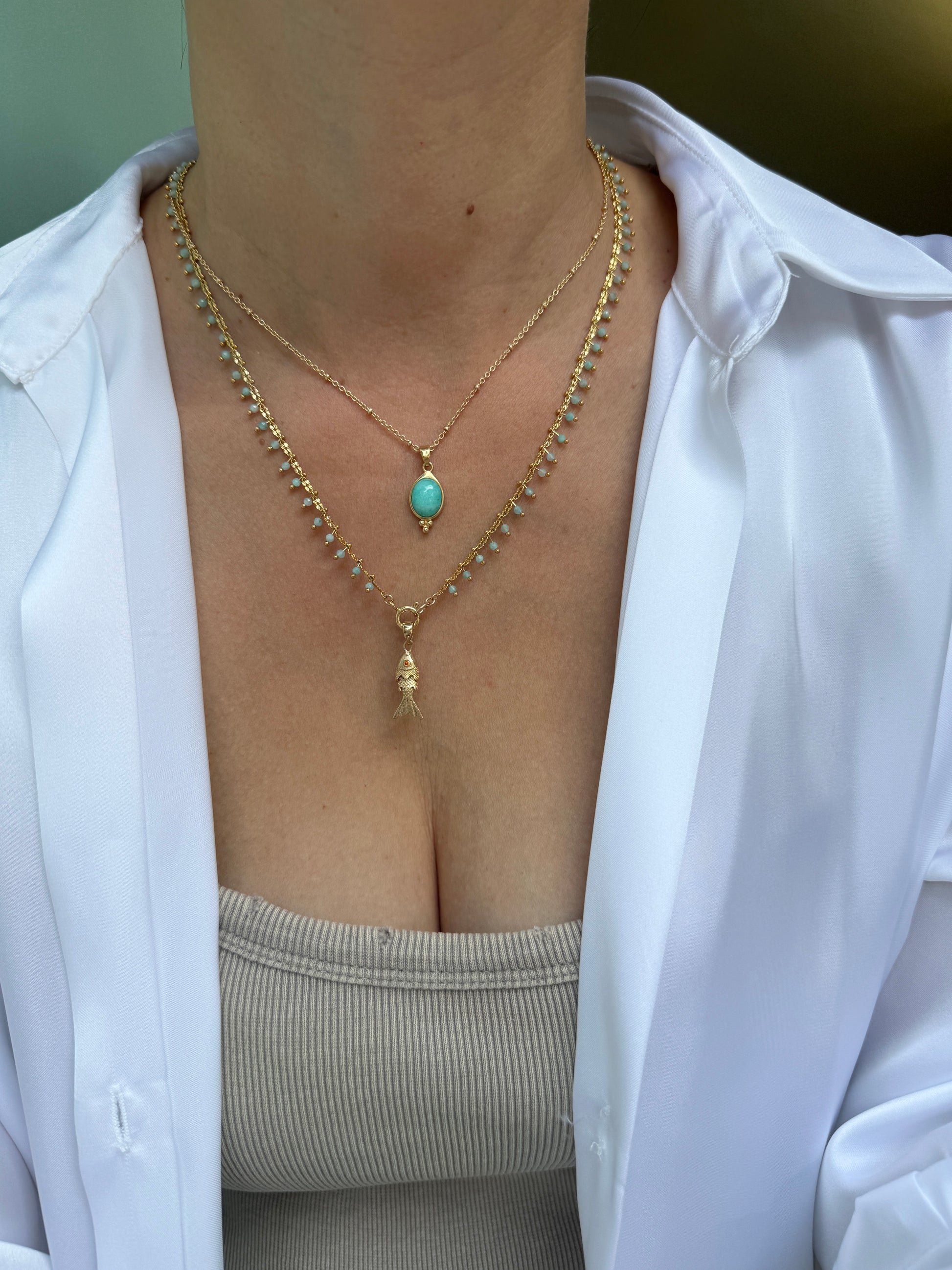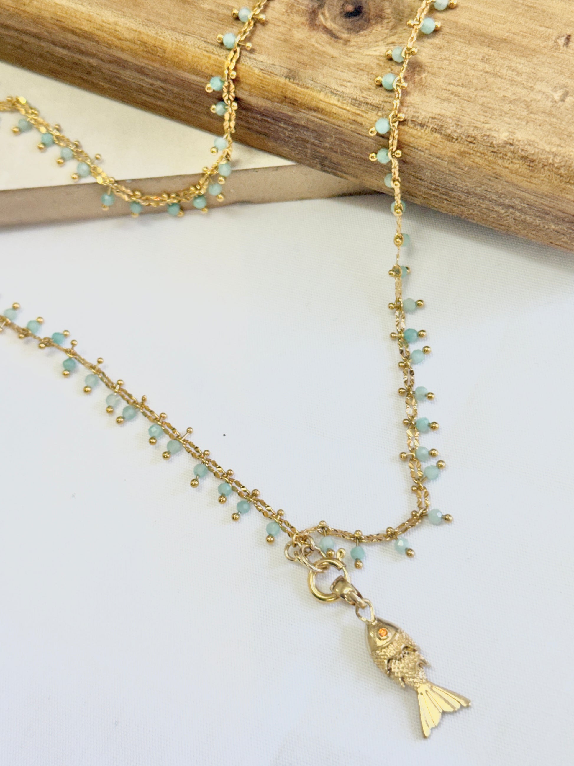 .שרשרת חרוזי אבני חן בגווני תכלת בשילוב תליון דג מוזהב מהמם