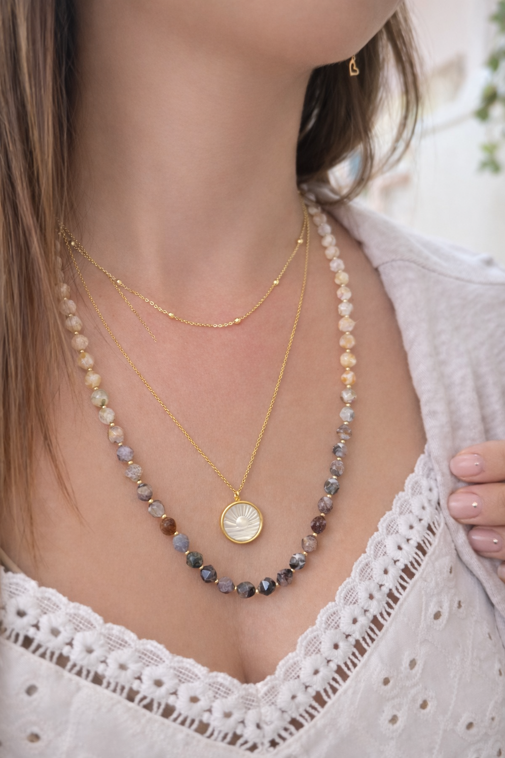 שרשרת עם תליון משולב צדף בצורת שמש לבחירתך בעיצוב נקי ומעודכן. שילוב הצדף יוצר תכשיט עם אופי טבעי ונוכחות שקטה ומשוחררת. השרשרת מוסיפה טאץ’ ימי אלגנטי, ומתאימה לענידה יומיומית וגם לשילוב שכבות עם שרשראות נוספות.